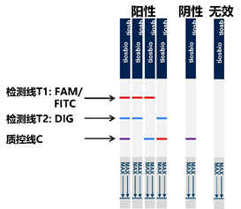 試紙條質控線(C線)和其中1條檢測線(T線)出現條帶,其中:T1為紅色,C線為藍色時,說明FAM標記信號分子的相應靶基因可判定為陽性;T2為藍色,C線為紅色時,說明Dig標記分子的相應的靶基因可判定為陽性。