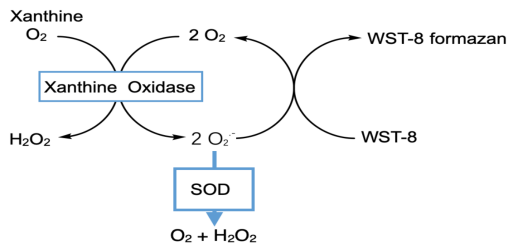 目前測定SOD比較先進的方法包括WST-1法和WST-8法,其中WST-8法比WST-1法更加穩定、靈敏度更高。本試劑盒采用了目前測定SOD方法中穩定性更好、靈敏度更高的WST-8法,可以檢測出低達0.5U/ml的超氧化物歧化酶。WST-8法的原理參考圖1,WST-8可以和黃嘌呤氧化酶(Xanthine Oxidase, XO)催化產生的超氧化物陰離子(O2.-)反應產生水溶性的甲臜染料(formazan dye),由于SOD能催化超氧化物陰離子發生歧化作用,所以該反應步驟可以被SOD所抑制,因此SOD的活性與甲臜染料的生成量成負相關,從而通過對WST-8產物的比色分析即可計算SOD的酶活力。