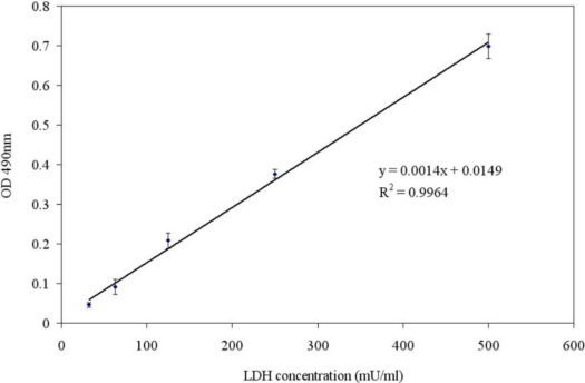 各孔數值減去空白對照后,以檢測的吸光度(OD490)為縱坐標,LDH酶活力(mU)為橫坐標,繪制LDH標準曲線。同時計算出該趨勢線的公式。
