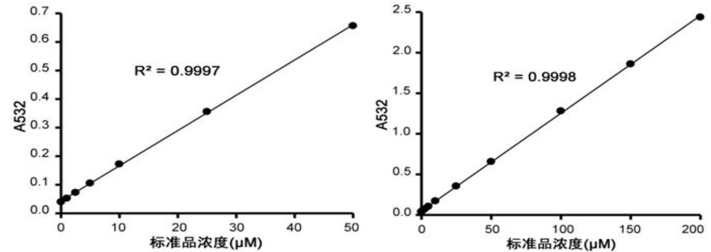 c.水浴冷卻至室溫,1000g室溫離心10分鐘。取200微升上清加入到96孔板中,隨后用酶標儀在532nm測定吸光度。如果不方便測定532nm的吸光度,也可以測定530-540nm之間的吸光度。可以設定450nm為參考波長進行雙波長測定。