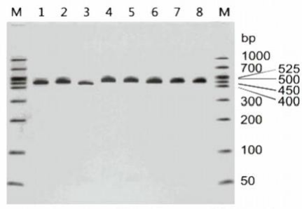 不同種類的支原體檢測條帶大小不同,下圖列出了引起細胞污染的8大種類常見支原體,若PCR條帶在400bp~600bp范圍內,均可判斷為支原體污染。也可將PCR產物進行TA克隆、測序進一步鑒定支原體的種類。