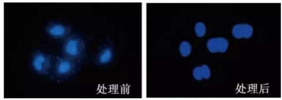 支原體清除劑處理支原體污染的 MCF-7 細胞,2天后經 DAPI 熒光染色法對前、后細進行染色對比。