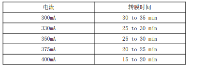 推薦使用恒流轉移,電流可設置350-400mA,轉膜液中離子成分較多,可以承受大電流,并且發熱量較低。