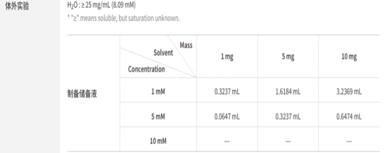 請根據(jù)產(chǎn)品在不同溶劑中的溶解度選擇合適的溶劑配制儲備液;?旦配成溶液,請分裝保存,避免反復(fù)凍融造成的產(chǎn)品失效。儲備液的保存?式和期限:-80°C, 6 months; -20°C, 1 month (sealed storage, away from moisture)。-80°C 儲存時,請在 6 個?內(nèi)使?,-20°C 儲存時,請在 1 個?內(nèi)使?。