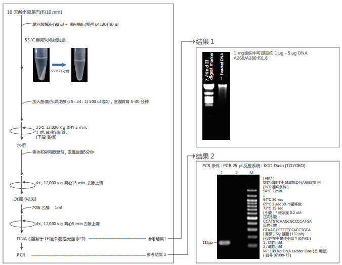 Sry 基因 (132 bp) 僅存在于雄性小鼠的 Y 染色體中。實驗結果 : 只檢測到雄性小鼠提取的 DNA 中含有 sry 基因,而雌性小鼠中沒有。表明采用 Tail Lysis Buffer 裂解小鼠尾部后,所提取的 DNA 能有效地通過 PCR 擴增。