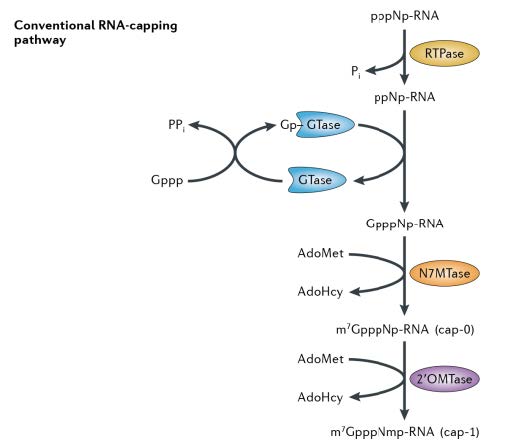 圖1. mRNA 帽結構 2′ -O-甲基轉移酶作用機理。mRNA 的帽結構是由一個7-甲基鳥苷通過一個5′–5′三磷酸酯橋連接到mRNA 鏈的5′核苷上組成。Cap-0 結構由相鄰的 RNA 鏈通過三種酶的依次反應形成。進一步形成 cap-1 結構需要 2′-O-甲基轉移酶的參與,該修飾可以降低 RNA 在體內引起的細胞先天免疫反應。本圖引自Decroly, E., Ferron, F., Lescar, J. et al. (2012). Conventional and unconventional mechanisms for capping viral mRNA. Nat Rev Microbiol 10, 51–65.