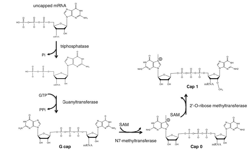 圖1. 參與mRNA 加帽的酶促途徑。Cap 0 結構 RNA 的產(chǎn)生需要牛痘病毒加帽酶:該酶兼具三磷酸酶、鳥苷轉移酶和鳥嘌呤甲基轉移酶的功能。其中S-腺苷甲硫氨酸(SAM)是甲基供體。一旦產(chǎn)生了Cap 0 結構,就可以通過2'-O-核糖甲基轉移酶進一步修飾以產(chǎn)生Cap 1 結構。本圖引自Michael Beverly , Amy Dell, Parul Parmar, Leslie Houghton et al (2016). Label-free analysis of mRNA capping efficiency using RNase H probes and LC-MS. Anal Bioanal Chem.