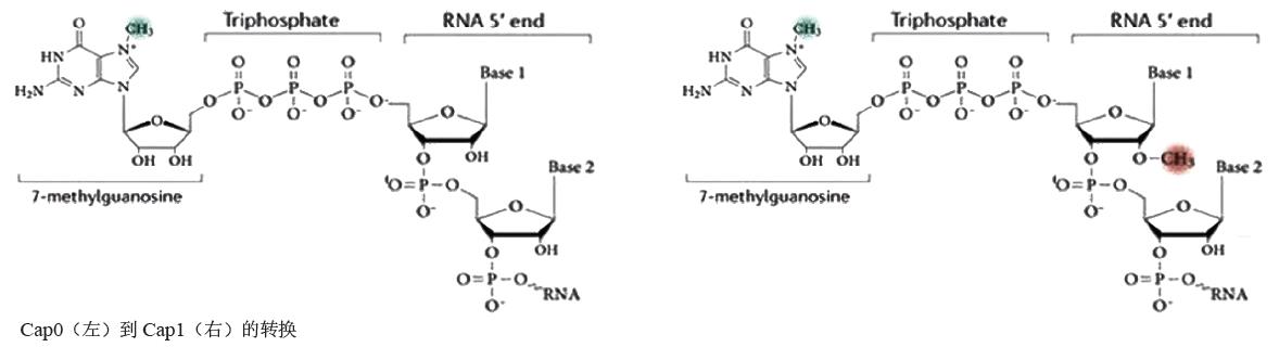Cap 0-和 Cap 1-mRNA:Cap 0-和 Cap 1-mRNA 之間的差異在 RNA 5'端緊鄰帽結構的第一位核苷酸(N1)是否具有 2'-O-甲基。在高等真核細胞中,該甲基化是天然加帽過程的一部分,Cap 1 結構提高了 mRNA 的翻譯效率。