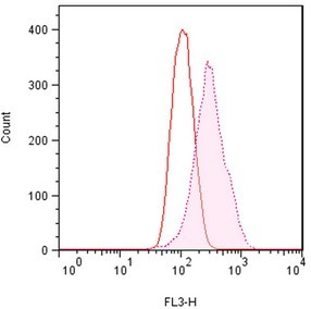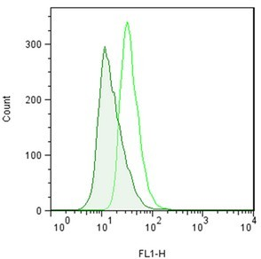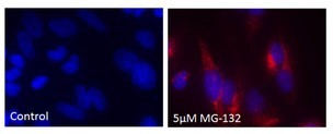 用0.2% DMSO模擬培育Jurkat細胞或在37℃下用5μM的MG-132過夜培育。用熒光素p62 Ab (1:500稀釋原液)培育細胞。清洗細胞后,通過流式細胞儀在FL1信道使用488nm的激光進行分析。在MG132處理的細胞時,熒光素p62 Ab的抗體信號增加約2.5倍。 |