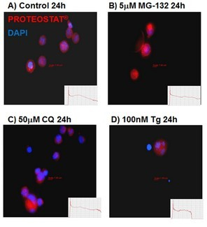 由內質網應激的自噬細胞產生的聚集小體和聚集小體類的包涵體,epi-熒光顯微成像圖。未經處理的K562細胞(A);加入5 mM MG-132溶液培育24小時(B);加入50 mM CQ培育24小時(C);加入100 nM毒胡蘿卜素(D)。在溫室下,用PROTEOSTAT? 染料(1:10,000稀釋)來固定染色細胞30分鐘。PROTEOSTAT? 的著色顯示 聚集體 和 ALIS呈紅色, DAPI 呈藍色。(Courtesy of the Flow Cytometry Core Facility, Blizard Institute, Queen Mary University of London, London, UK) |