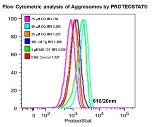 用0.2% DMSO模擬培育Jurkat細胞或在37℃下用5μM的MG-132過夜培育。然后,用proteostat?染料孵育和固定細胞,不需清洗然后直接通過流式細胞儀,在FL3信道使用488nm的激光進行分析。在MG-132處理的細胞時,紅色熒光信號增加了約3倍。上述的操作會影響蛋白質聚集小體的檢測。 |