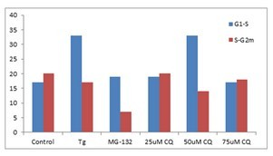 分別25,50,75mmCQ,100nM的毒胡蘿卜素(TG)或5mM的MG-132處理K562細胞24小時。然后在溫室下用PROTEOSTAT?染料(1:10,000稀釋)固定并透化培育細胞30分鐘。接著在BD LSR II的藍色610/20nm的信道分析細胞(30,000)。Courtesy of the Flow Cytometry Core Facility, Blizard Institute, Queen Mary University of London, London, UK. |