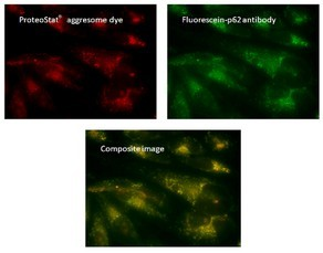 預先用5μMMG-132培育帶有HeLa細胞的聚集小體12小時,用ProteoStat?聚集體小染料來染色觀察(左上圖),與熒光素p62的抗體(右上圖)共定位,通過熒光顯微鏡觀察的合成圖像(下圖)。 |