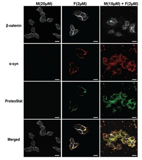 α-syn混合物形式聚集在被內化到M17神經母細胞瘤細胞系的細胞質膜。用α-syn單體處理M17細胞,聲波處理α-SIGN PFFs或α-SYN混合物(M + F)。四天后,在固定M17細胞前,將其清洗3次,用 PROTEOSTAT?聚合染料(綠色)染色和用抗α-syn(紅)和β連環蛋白(灰色)免疫染色。比例尺= 20μm。作者提到“Fibril生長和播種量α-synuclein蛋白介導的細胞凋亡中發揮重要作用。”此圖來自A-L Mahul-Mellier, et al.; Cell Death & Differentiation (2015). (doi:10.1038/cdd.2015.79). |