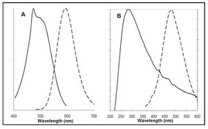 ![]() 在PROTEOSTAT?聚集小體檢測試劑(A)和Hoechst 33342核染色(B)的激發和發射光譜。