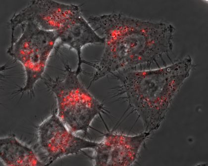 The two images below show cells transfected using METAFECTENE? FluoR and pCMV-eGFP. They clearly show the endocytotic uptake of red fluorescent lipoplexes in the cells and their perinuclear accretion. In addition, the superimposed shots of the fluorescence channels enable you to view the incipient expression of GFP by moving the cursor over the desired image.