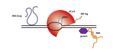含有20個核苷酸與所需基因組區域互補的指導RNA (gRNA)與標記的酶活性不活躍的Cas9蛋白(dCas9)結合表達。gRNA將dCas9蛋白定向到目標序列,形成RNA-DNA異雙工。然后使用針對am標記的dCas9蛋白的抗體在細胞上進行染色質免疫沉淀,以富集由gRNA/dCas9復合物結合的基因組序列。