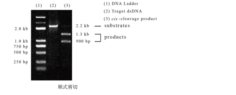 *若用核酸電泳來分析順式剪切產物,對于 20 μL 順式剪切應體系,推薦 target DNA的使用量為 100 ng~500 ng,且 target DNA片段長度在 300 bp~3 kb 范圍內。不同長度 target DNA 需要的 Cas 酶和 sgRNA 的量需要根據 target DNA 的摩爾量計算,建議保持 Cas 酶:sgRNA:target DNA的摩爾比為 10:10:1,以盡量確保 target DNA被剪切完全。