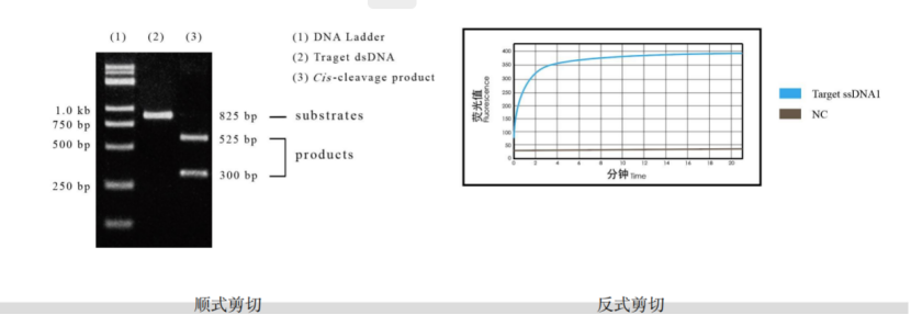 *若用核酸電泳來分析順式剪切產物,建議使用 dsDNA靶標,因為 ssDNA靶標會被反式激活的 Cas12a 進一步切碎。對于 20 μL 順式剪切應體系,推薦 target DNA的使用量為 100 ng~500 ng,且 target DNA片段長度在 300 bp~3 kb 范圍內。不同長度 target DNA需要的 Cas 酶和 crRNA的量需要根據 target DNA的摩爾量計算,建議保持 Cas 酶:crRNA:target DNA的摩爾比為 10:10:1,以盡量確保 targetDNA被剪切完全。