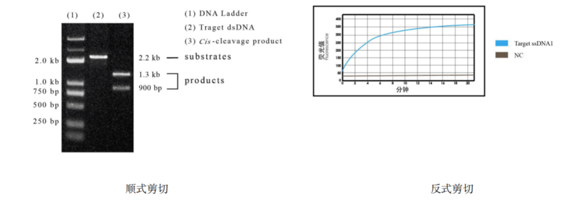 *若用核酸電泳來分析順式剪切產物,建議使用 dsDNA靶標,因為 ssDNA靶標會被反式激活的 Cas12b 進一步切碎。對于 20 μL 順式 剪切應體系,推薦 target DNA的使用量為 100 ng~500 ng,且 target DNA片段長度在 300 bp~3 kb 范圍內。不同長度 target DNA需要 的 Cas 酶和 sgRNA的量需要根據 target DNA的摩爾量計算,建議保持 Cas 酶:sgRNA:target DNA的摩爾比為 10:10:1,以盡量確保 target DNA被剪切完全。
