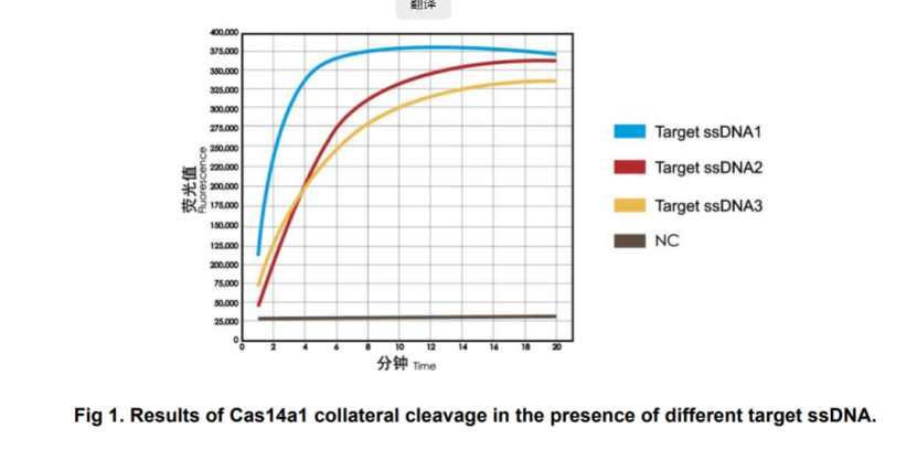 例:若某批次 Un1Cas12f1 酶的反式切割活性為 0.7 transU/pmol,則表明 1 pmol 的該批次 Un1Cas12f1酶可在 1 min 內,在上述指定的反應條件下,反式切割 0.7 pmol ssDNA 探針。本公司提供的 Cas 酶 transU數值詳見各批號的 COA 檢測報告。