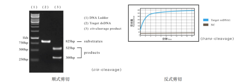 l若用核酸電泳來分析順式剪切產物,建議使用 dsDNA靶標,因為 ssDNA靶標會被反式激活的 Cas12a 進一步切碎。對于 20 μL 順式剪切應體系,推薦 target DNA的使用量為 100 ng~500 ng,且 target DNA片段長度在 300 bp~3 kb 范圍內。不同長度 target DNA需要的 Cas 酶和 crRNA的量需要根據 target DNA的摩爾量計算,建議保持 Cas 酶:crRNA:target DNA的摩爾比為 10:10:1,以盡量確保 targetDNA被剪切完全。