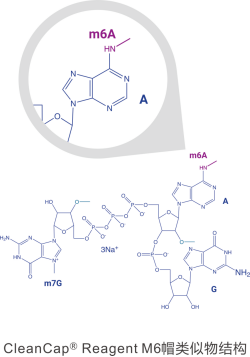 TriLink新推出的CleanCap M6[CleanCap?m6AG(3’OMe)]帽類似物用于mRNA的共轉錄加帽,產生Cap 1修飾的mRNA。CleanCap?M6使用與CleanCap?AG和CleanCap? AG(3’OMe)相同的5’AG起始序列,但CleanCap? M6在第一個腺苷第6個位置上增加了一個甲基(m6A),可以進一步增加蛋白表達。有文獻研究(Mauer et al. 2017)可能原理就是臨近7-甲基鳥苷帽子附近的m6A修飾可以通過阻止酶介導的脫帽而保證mRNA的穩定性從而進一步增加蛋白表達。CleanCap? M6可與野生型堿基或TriLink的目錄貨號帶修飾的NTPs結合使用,如N1- Methylpseudouridine-5’-Triphosphate(N-1081), Pseudouridine5’-Triphosphate(N-1019)和5-Methoxyuridine-5’-Triphosphate (N-1093)。