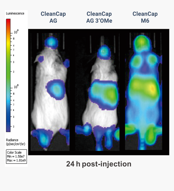 FlucmRNA在LNP遞送系統的尾靜脈注射小鼠模型中的表現。每組1mg/Kg劑量注射后,測量熒光素酶活性,單位為每秒光子數。組與組之間的差異只有CleanCap?加帽類似物。所有其他變量都受控制。 |
