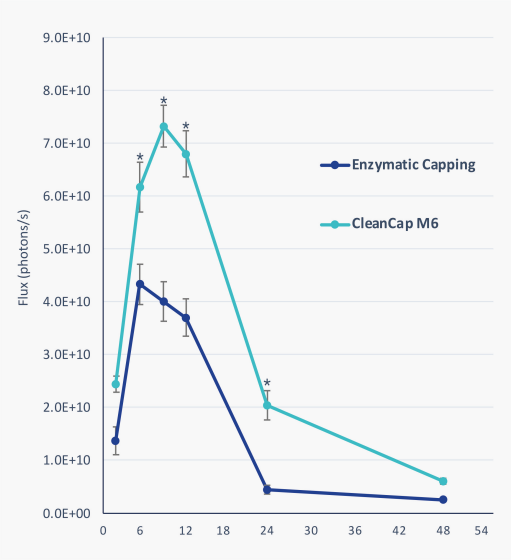 與酶法加帽策略相比,CleanCap? M6加帽類似物顯著表現出更高的蛋白質翻譯(FLuc)效率,從而能提高蛋白產量。 |