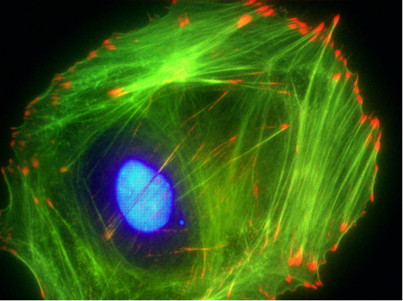 Swiss 3T3 cell stained with anti-vinculin (red), Dapi (blue nucleus) and F-actin is stained with Acti-stain? 488 (green F-actin, Cat.# PHDG1).
