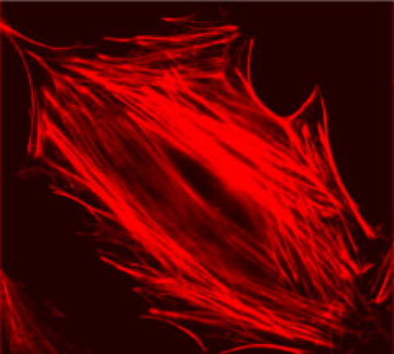 Figure 1. A Swiss 3T3 fibroblast stained with rhodamine phalloidin (PHDR1). The phalloidin binds specifically to F-actin and does therefore stain the actin stress fibers in the cell