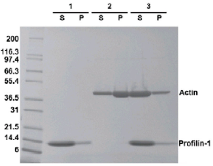Actin Polymerization Inhibition Assay. The ability of profilin to inhibit actin polymerization was assessed by SDS-PAGE of proportionally loaded supernatant (S) and pellet (P) fractions from G-actin incubated with and without profilin-1 according to the assay method. In the absence of profilin-1, approx. 80% of the actin protein (43kDa) is found in the pellet fraction as F-actin (P, lane 2). When G-actin is incubated with profilin prior to polymerization, only 20% approx. of actin is found as F-actin in the pellet (P, lane 3), while the other 80% remains as G-actin in the supernatant (S, lane 3). Lane 1, profilin-1 protein alone. Mark12 molecular weight markers are from Invitrogen.