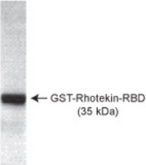 The Rho binding domain (RBD) of the human Rhotekin protein has been expressed as a GST-fusion protein in E. coli. This protein binds binds specifically to GTP-bound, and not GDP-bound, RhoA, RhoB and RhoC proteins. The domain can therefore be used to specifically precipitate active, GTP-bound Rho proteins as well as to specifically block the activity of RhoA/B/C in vitro and in vivo.