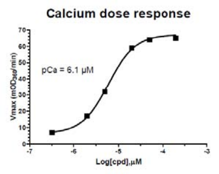 Legend: The sarcomere assay was set up as described in the protocol above. Calcium was titrated between 2 and 200 μM andthe results plotted on this dose response graph. pCa = 6.1 μM is similar to published pCa values for reconstituted cardiac sarcomeres (Holroyde et al. 1980, Fig.6).