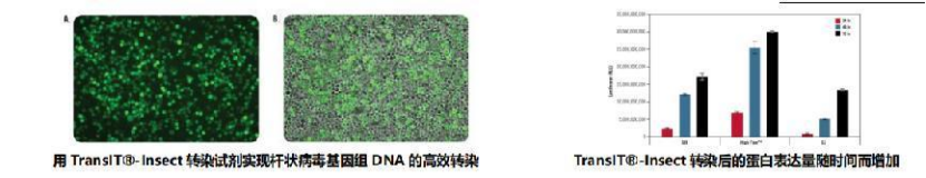 ·TransIT?-Insect Transfection Reagent 昆蟲細胞專用轉(zhuǎn)染試劑,用于制備高滴度桿狀病毒瞬時轉(zhuǎn)染和重組桿狀病毒制備是昆蟲細胞表達常用方法,TransIT?-Insect 是一款專用于多種昆蟲細胞系的高效 DNA 轉(zhuǎn)染試劑。