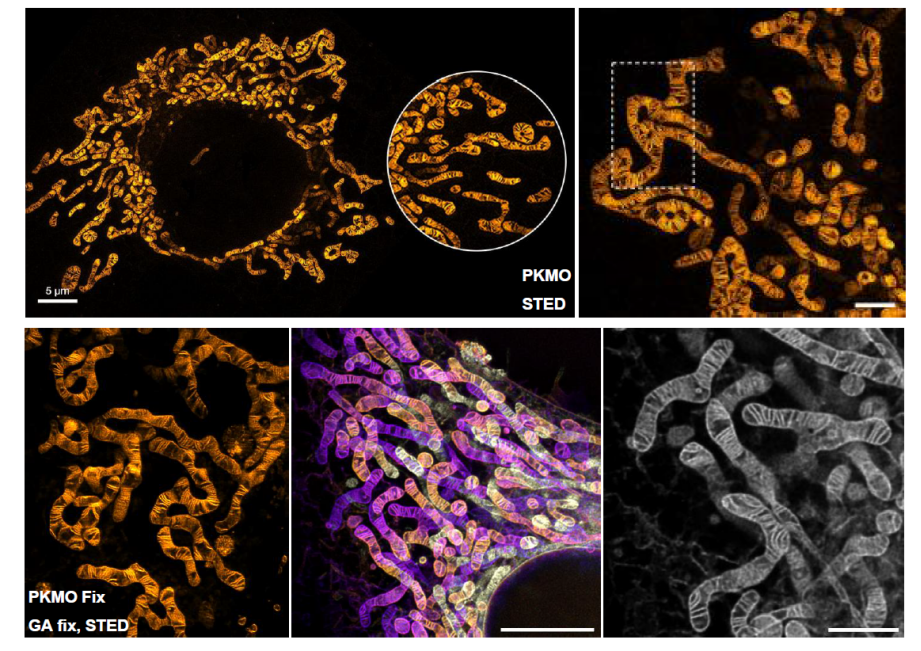 PKMITO??系列的Red、Orange?及Deep Red 具有非常低的化學毒性、光學毒性和優秀的線粒體定位能力,適用于活細胞線粒體成像。除此之外,此系列產品也已經在斑馬魚等小動物實驗中用于線粒體成像。PKMO FX 在細胞經醛類固定液固定后依然有高的線粒體熒光保留,適用于固定細胞線粒體成像。綜合這些優異的性能,PKMITO??系列產品非常適合用于多種場景下的線粒體成像,尤其在SIM?和STED 等超分辨成像和細胞分選等領域。