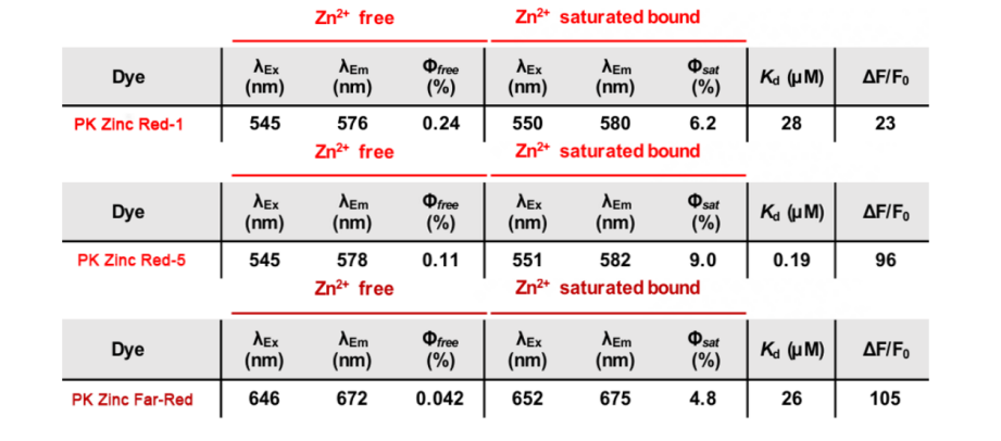 PK Zinc Red-5的親和力最強(qiáng),信噪比也最高,所以檢測(cè)信號(hào)的效果最好,PK Zinc Red-1和PK Zinc Red-5 本質(zhì)區(qū)別就是親和力。