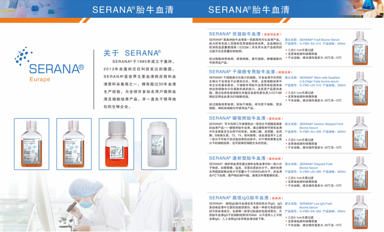Serana公司的胎牛血清,目前在國內很多高校、科研院所、研發公司的細胞培養過程中獲得了非常廣泛的使用,產品質量也贏得了大家的良好口碑。