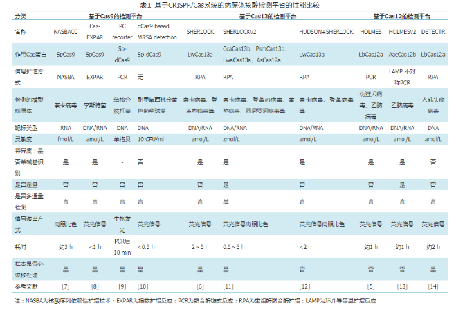 2019年,James課題組提出了一種對傳統材料進行分子編程后用于生物傳感的策略。他們將Cas12a-gRNA復合物嵌入連有單鏈DNA的晶格結構中制成水凝膠[15]。當水凝膠系統暴露于靶標DNA存在的環境中時,Cas12a被激活,其對周圍單鏈DNA的反式切割使得水凝膠的骨架被剪切破壞,從而造成水凝膠的塌陷。在生物傳感方面,用此策略檢測了葡萄球菌的mecA基因片段,激活的Cas12剪切將淬滅熒光基團連接于凝膠骨架的單鏈DNA,導致熒光信號產生。他們還將水凝膠嵌入微流控紙質設備中,開發了一種可以對埃博拉病毒進行實施快速檢測的試紙條,這種試紙條在實戰中表現出相當好的靈敏度和可重復性。新穎的組合方式使得老材料用了新用法,這種創新的思路可以催生更多新穎的生物傳感策略[16]。表1比較了上述具有代表性的基于CRISPR/Cas系統的病原體檢測分子診斷平臺的性能。