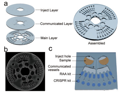 近期,南方科技大學的研究人員開發了一種雙CRISPR/Cas12a輔助的逆轉錄-重組酶介導擴增(RT-RAA)檢測方法和“樣本進-結果出”的離心微流控平臺,該平臺可在30min內自動檢測1拷貝/μL的新冠病毒(SARS-CoV-2),具有一步、自動化、快速和靈敏的優點,在臨床診斷和疾病預防方面具有重大潛力。相關研究成果以“Dual-CRISPR/Cas12a-Assisted RT-RAA for Ultrasensitive SARS-CoV?2 Detection on Automated Centrifugal Microfluidics”為題發表于Analytical Chemistry期刊。