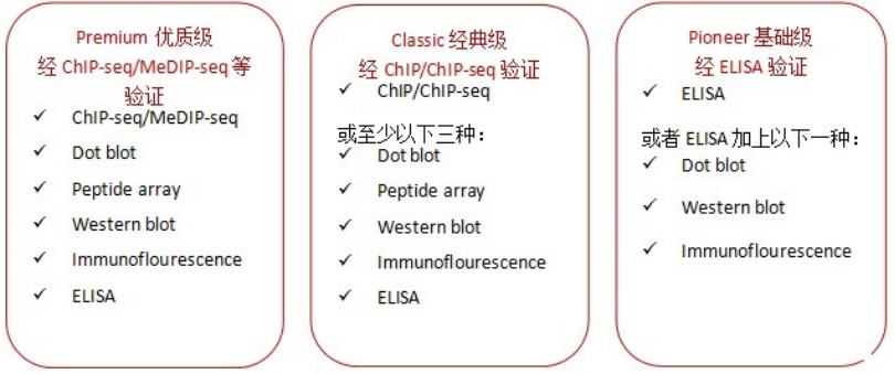 自2004年以來,Diagenode就與領先的表觀遺傳學專家和表觀遺傳學聯盟合作生產、驗證包括抗體在內的表觀遺傳學試劑。2012年,Diagenode用一種創新、嚴謹的抗體分類系統改革了免疫沉淀技術,用于表觀遺傳學研究。根據驗證水平將抗體分為三個不同級別,以幫助您建立選擇抗體的信心。最終,用您信任的抗體獲得滿意的結果。