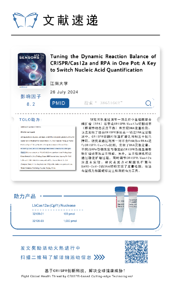 近期,江南大學生物工程學院徐巖教授團隊吳群教授課題組在新型微生物定量檢測技術的開發中取得了重要進展,研究成果“Tuning the Dynamic Reaction Balance of CRISPR/Cas12a and RPA in One Pot: A Key to Switch Nucleic Acid Quantification”以主封面文章形式正式發表于《ACS Sensors》雜志(IF:8.9)(https://doi.org/10.1021/acssensors.3c02485)。