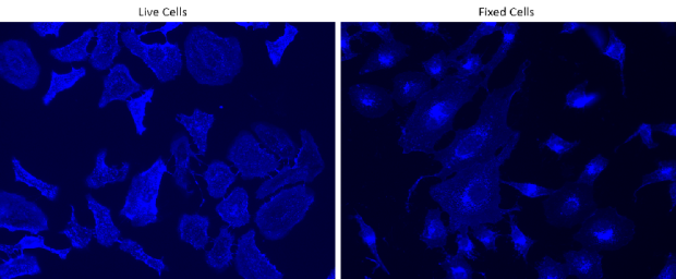 圖3. 用 10 µg/mL 的 iFluor350小麥胚芽凝集素 (WGA)探針 對活的和固定的 HeLa 細胞進行染色 30 分鐘。使用 DAPI 濾光片組在熒光顯微鏡上獲取圖像。