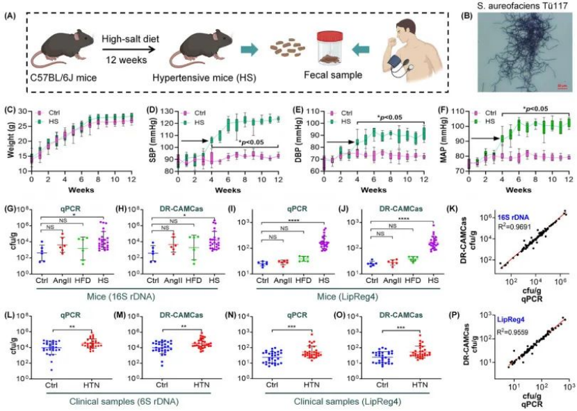 (A)高血壓患者和高鹽飲食誘導的高血壓模型小鼠的糞便樣本。(B)金色鏈霉菌 Tü117 的革蘭氏染色。比例尺:20μm。高鹽飲食小鼠對體重(C)、收縮壓(D)、舒張壓(E)和平均動脈壓(F)的影響(n = 12)。(G - J)使用 DR-CAMCas 和 qPCR 檢測高血壓小鼠糞便樣本中的 16S rDNA 和 LipReg4 基因(對照組:6 只;血管緊張素 II 組:6 只;高脂飲食組:6 只;高鹽組:24 只)。(L - O)使用 DR-CAMCas 和 qPCR 檢測臨床樣本(正常人:30 人;高血壓患者:30 人)糞便樣本中的 16S rDNA 和 LipReg4 基因。(K,P)評估 DR-CAMCas 和 qPCR 在臨床樣本檢測中的一致性。*p < 0.05 與對照組相比,**p < 0.01 與對照組相比,****p < 0.0001 與對照組相比。