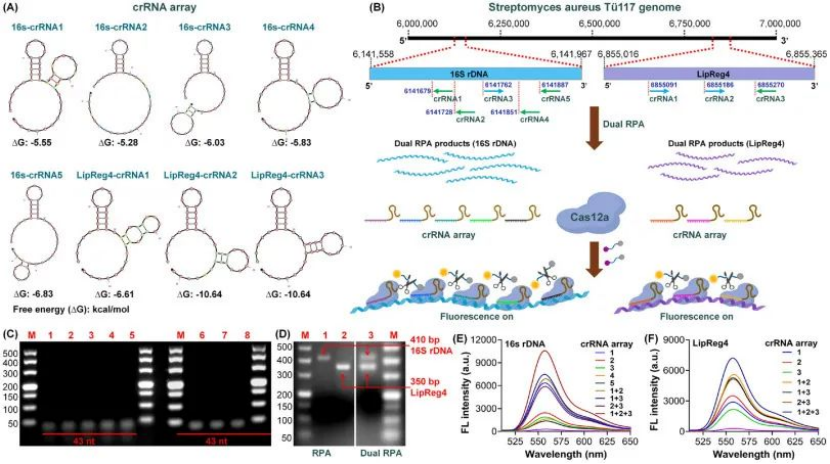 (A)crRNA 陣列的結構、自由能和瓊脂糖凝膠。(B)crRNA 陣列的識別位點、雙重 RPA 過程以及 crRNA 陣列介導的 CRISPR/Cas12a 檢測信號的疊加效應。(C)crRNA 陣列的瓊脂糖凝膠。(D)雙重 RPA 和單獨 RPA 產物的瓊脂糖凝膠。(E、F)使用不同 crRNA 檢測 16S rDNA 和 LipReg4 基因的熒光光譜(金色鏈霉菌 Tü117:107 cfu/mL)。