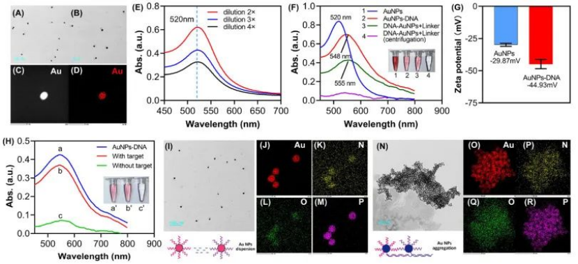 比色探針的表征。金納米粒子的 TEM 圖像(A、B)、映射圖像(C)和 EDS 分析(D)。(B)系列金納米粒子稀釋液的紫外-可見吸收光譜。(F)金納米粒子、金納米粒子-DNA 以及與 DNA 連接子交聯的金納米粒子-DNA 對的紫外-可見吸收光譜。(G)用 Arm-DNA 修飾前后的金納米粒子的 Zeta 電位。(H)比色檢測可行性評估。使用 DR-CAMCas 測定法與目標 DNA 反應后比色探針的 TEM 圖像(I)和元素分析(J-M)。使用 DR-CAMCas 測定法在沒有目標 DNA 的情況下比色探針的 TEM 圖像(N)和元素分析(O-R)。
