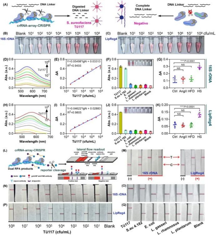 金黃色鏈霉菌 Tü117 的比色法和即時檢測。(A)金黃色鏈霉菌 Tü117 的肉眼檢測過程。照片(B、C)金黃色鏈霉菌 Tü117 濃度增加時 16S rDNA 和 LipReg4 基因肉眼檢測的紫外-可見吸收光譜(D、H)及相應的線性擬合曲線(E、I)。(F、J)比色 DR-CAMCas 方法對金黃色鏈霉菌 Tü117 檢測的選擇性。(G、K)比色 DR-CAMCas 檢測法在高血壓小鼠糞便樣本檢測中的實際應用。(L)DR-CAMCas 在側流生物傳感器(LFB)中的整合。基于 DR-CAMCas 的 LFB 檢測法對金黃色鏈霉菌 Tü117 的 16S rDNA 和 LipReg4 基因檢測的可行性(M)、檢測性能(N、P)和選擇性分析(O、Q)