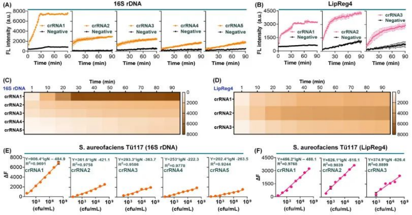 單鏈向導 RNA(single crRNA)介導的 CRISPR/Cas12a 與雙重重組酶聚合酶擴增(dual RPA)耦合對 16S rDNA 和 LipReg4 基因的熒光響應(A、B)以及隨時間變化在不同單鏈向導 RNA 存在下的熱圖。(E、F)使用單鏈向導 RNA 介導的 CRISPR/Cas12a 與雙重 RPA 耦合檢測 16S rDNA 和 LipReg4 基因的檢測性能。