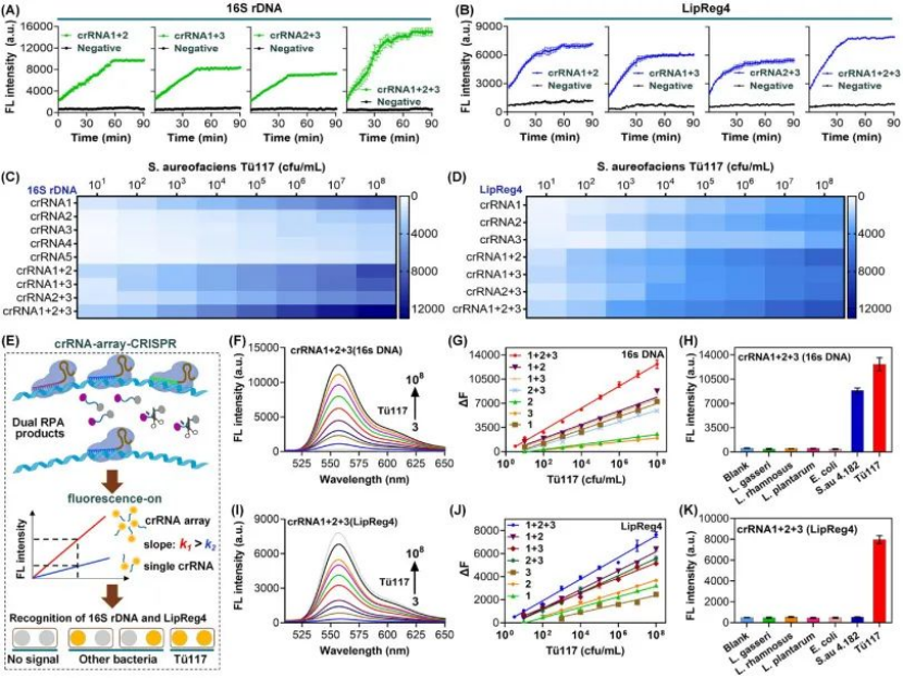 DR-CAMCas 方法對金色鏈霉菌 Tü117 檢測的檢測性能。(A、B)DR-CAMCas 檢測對 16S rDNA 和 LipReg4 基因的熒光響應隨時間變化。(C、D)在不同 crRNA 存在下,由 16S rDNA 和 LipReg4 基因誘導的 DR-CAMCas 終點熒光熱圖。(E)使用 DR-CAMCas 對金色鏈霉菌 Tü117 的識別過程。DR-CAMCas(crRNA1 + 2 + 3)對金色鏈霉菌 Tü117 的 16S rDNA 和 LipReg4 基因的熒光響應(H、K)和選擇性(H、K)。(G、J)使用不同 crRNA 組合的 DR-CAMCas 對 16S rDNA 和 LipReg4 基因的檢測性能。