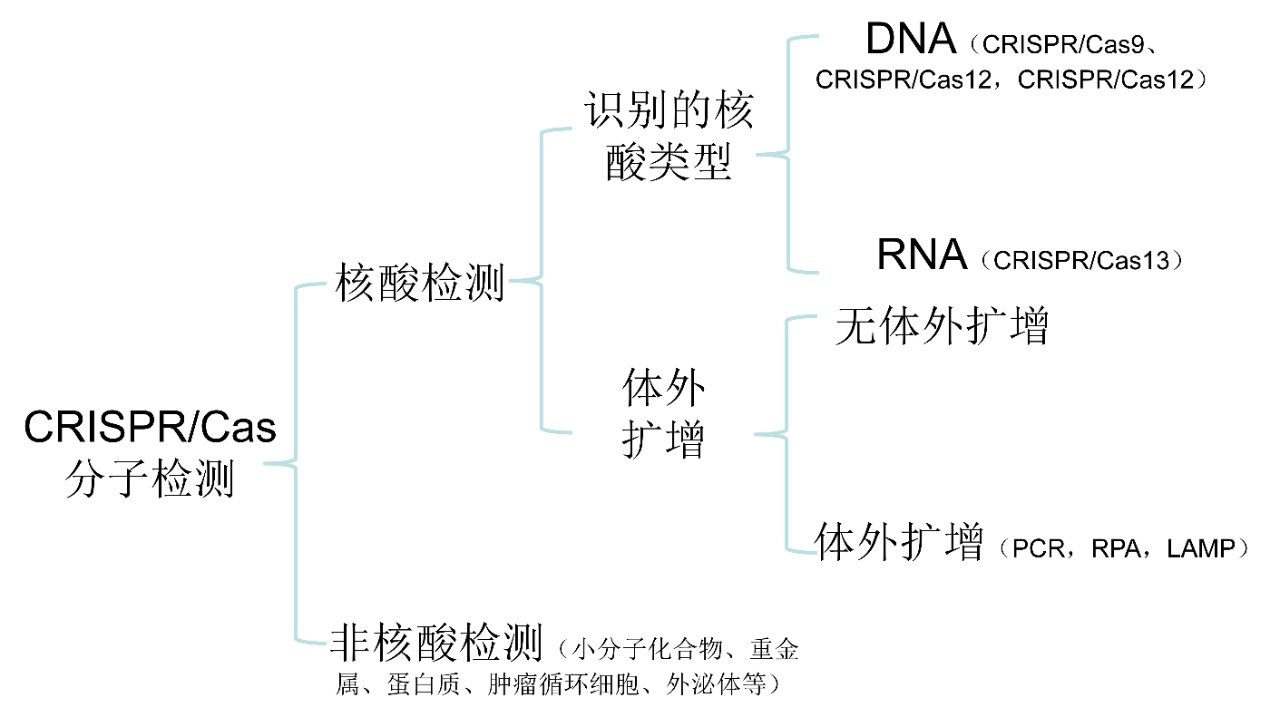 根據檢測核酸分子時是否需要體外核酸擴增,CRISPR/Cas技術核酸檢測可分為輔助體外核酸擴增檢測和無體外核酸擴增檢測兩類。輔助體外核酸擴增檢測需先利用PCR、重組酶聚合酶等溫擴增(RPA)、環介導等溫擴增(LAMP)等技術,對靶向核酸序列進行體外擴增,隨后再通過CRISPR/Cas系統檢測靶標分子。與之不同,基于CRISPR/Cas的無體外核酸擴增檢測技術,能夠直接對靶標核酸進行檢測,具有操作步驟簡便、檢測耗時短、污染風險低等優點。